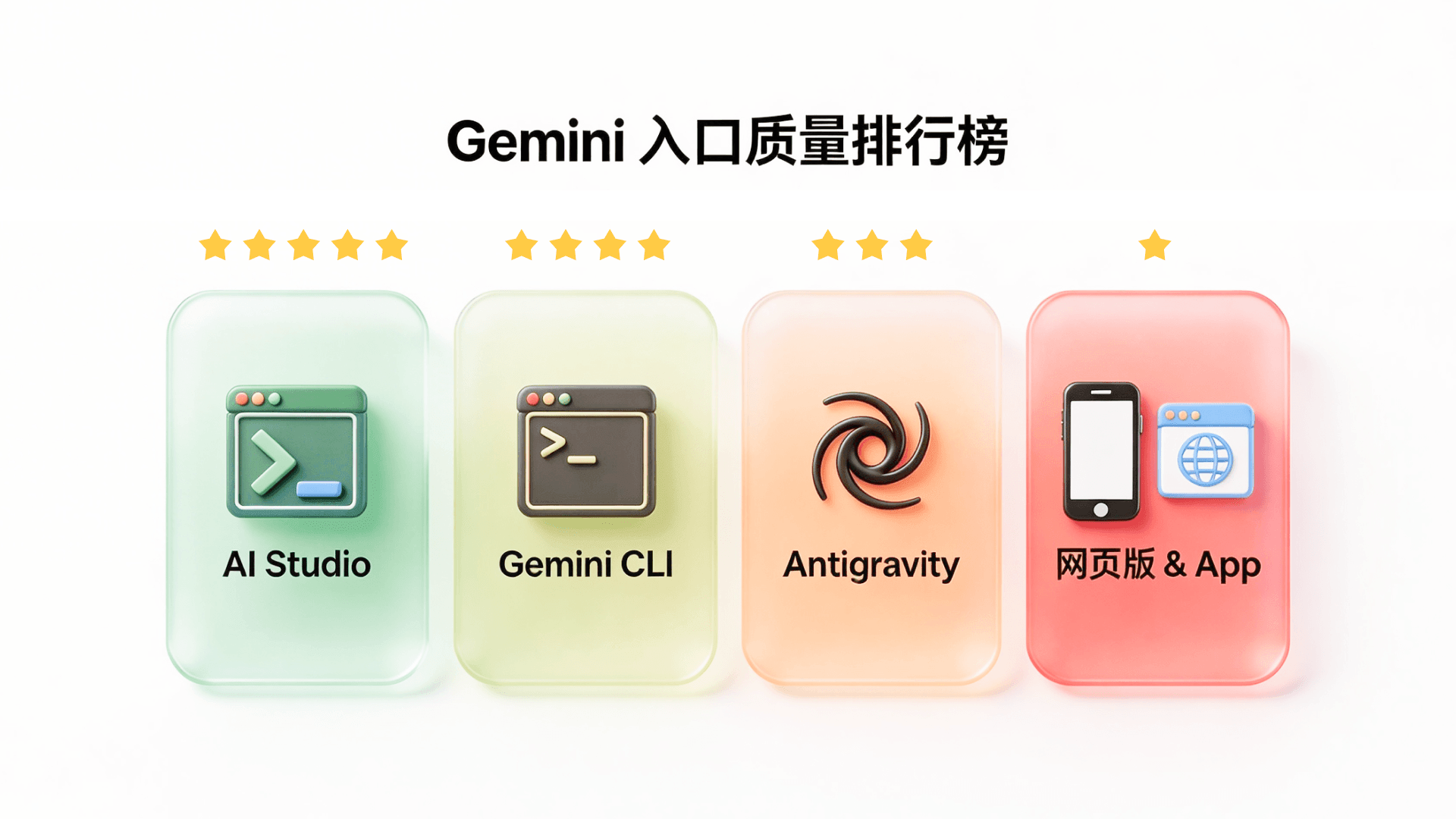AI Studio > Gemini CLI > Antigravity > 网页版 & App